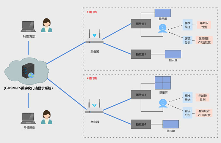 该客户为宁波地区零售门店,在一段时间内,客户发现门店销售额持续下滑,但是不知道原因出在哪里,到底是消费者减少,还是广告推送出现问题,亦或是其他原因,客户没有头绪,非凡游戏(中国)科技数据化门店显示系统完美的解决了客户痛点,方案拓扑图如下: